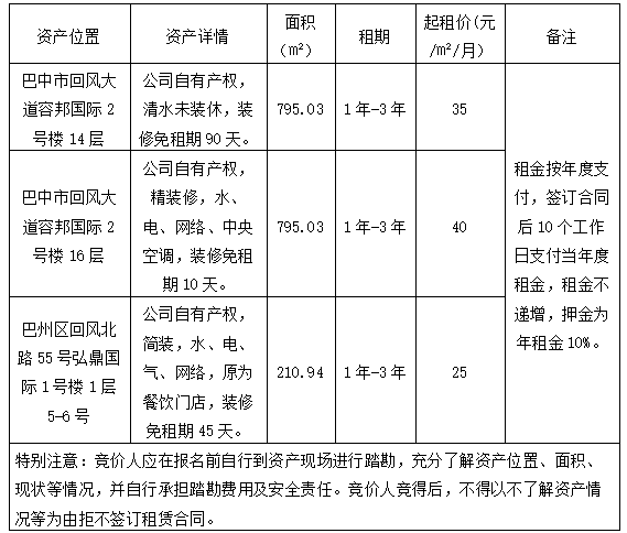 根據(jù)國有資產(chǎn)管理相關(guān)規(guī)定,巴中自然資源投資集團(tuán)有限公司決定對(duì)相關(guān)資產(chǎn)進(jìn)行公開招租?,F(xiàn)將有關(guān)事項(xiàng)公告如下: